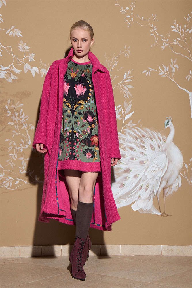 The Mabel Oil Mini Dress is a charming piece with distinctive wool hot pink details around the neckline and the end of the short sleeves. The frills on the front part of the neck make this attractive look even more joyful.