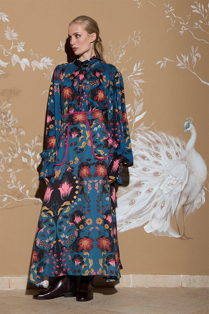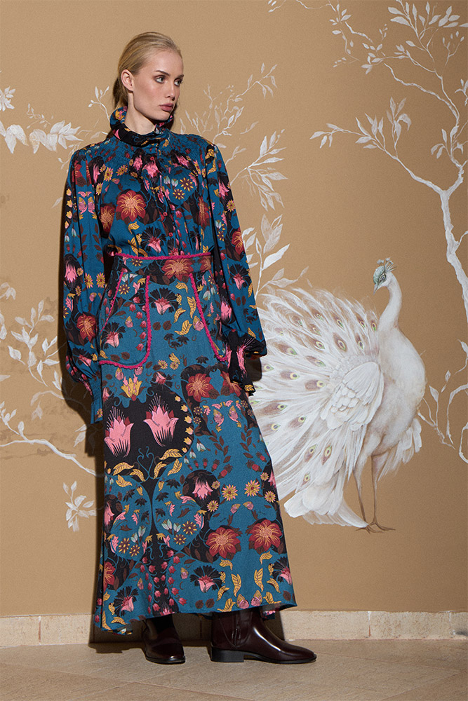 The Mabel Petrol Skirt is a maxi and high waist design made of the most alluring print. The large external pockets are highlighted by the hot contrast pink piping showcasing an ethereal combination that lights up the season. The zipper on one side allows the perfect adjustment and offers one firm and delicate waist.