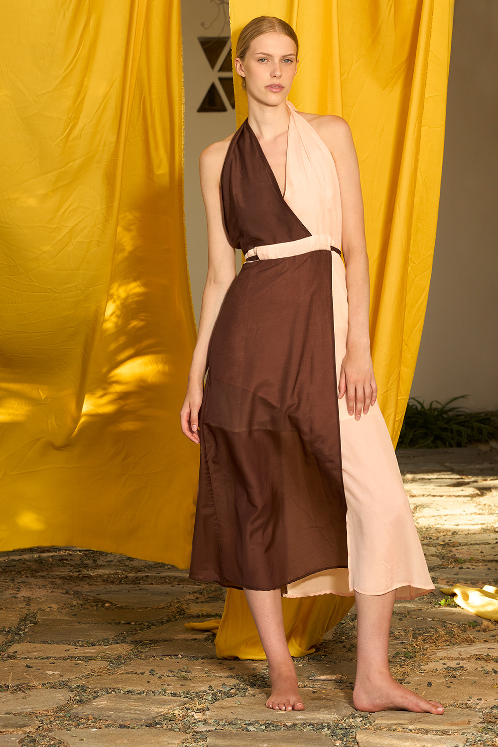 The Magdalena Chocolate Pink Dress is a double colored midi length wrapped design made of silk. The halter neckline that tights at the back of the neck allows the hands to feel the breeze while the open back gives away some extra summer feeling. The belt around the waist offers this dress even more charm and adjustment and the zipper on the center back makes it easy to wear.
