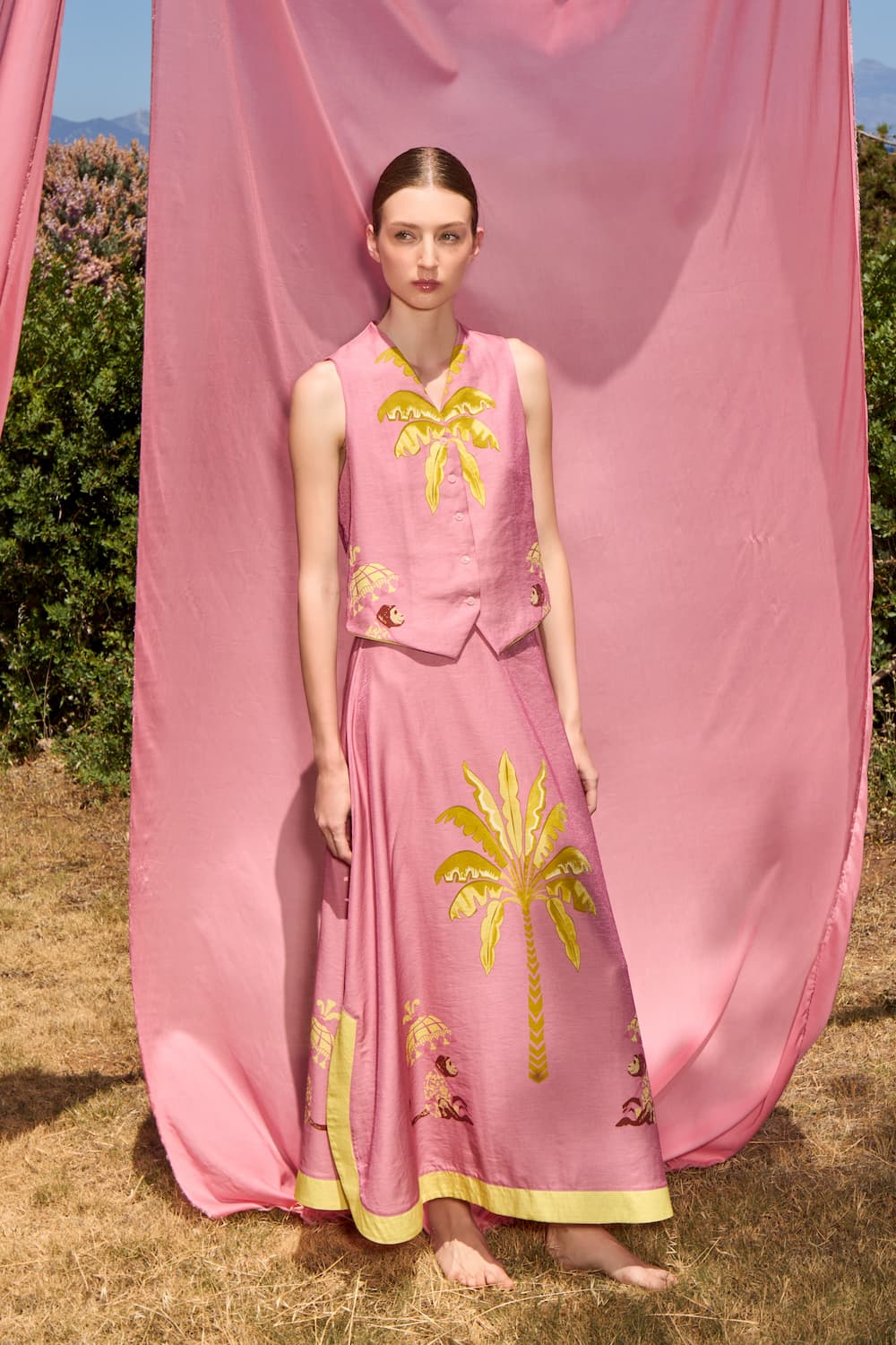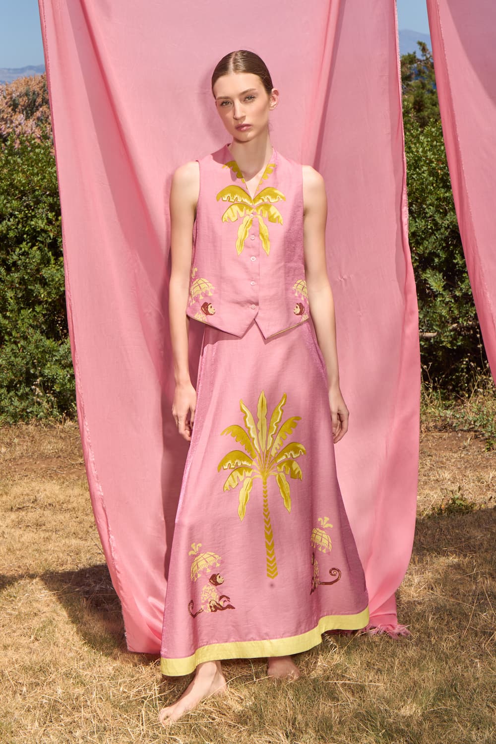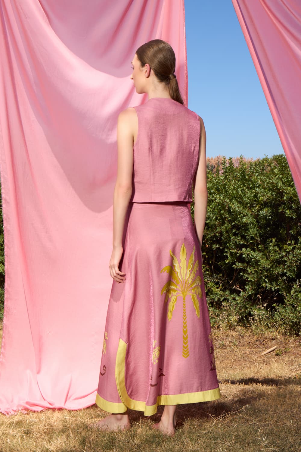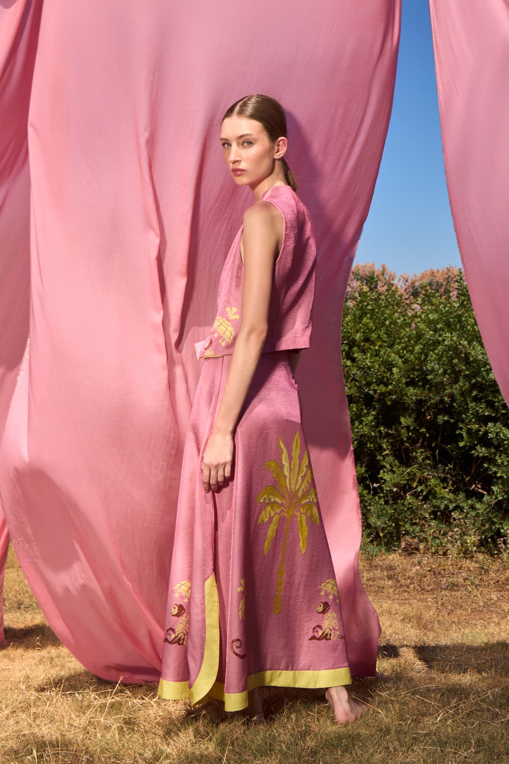 Mankey Pink Skirt is an elegant and artistic maxi skirt featuring a bold pattern. The high waist along with the round hem and the slits are creating an unforgettable image. Crafted from a unique combination of fabrics this skirt offers effortless movement and a sophisticated silhouette.