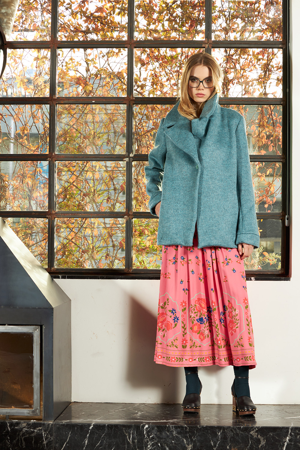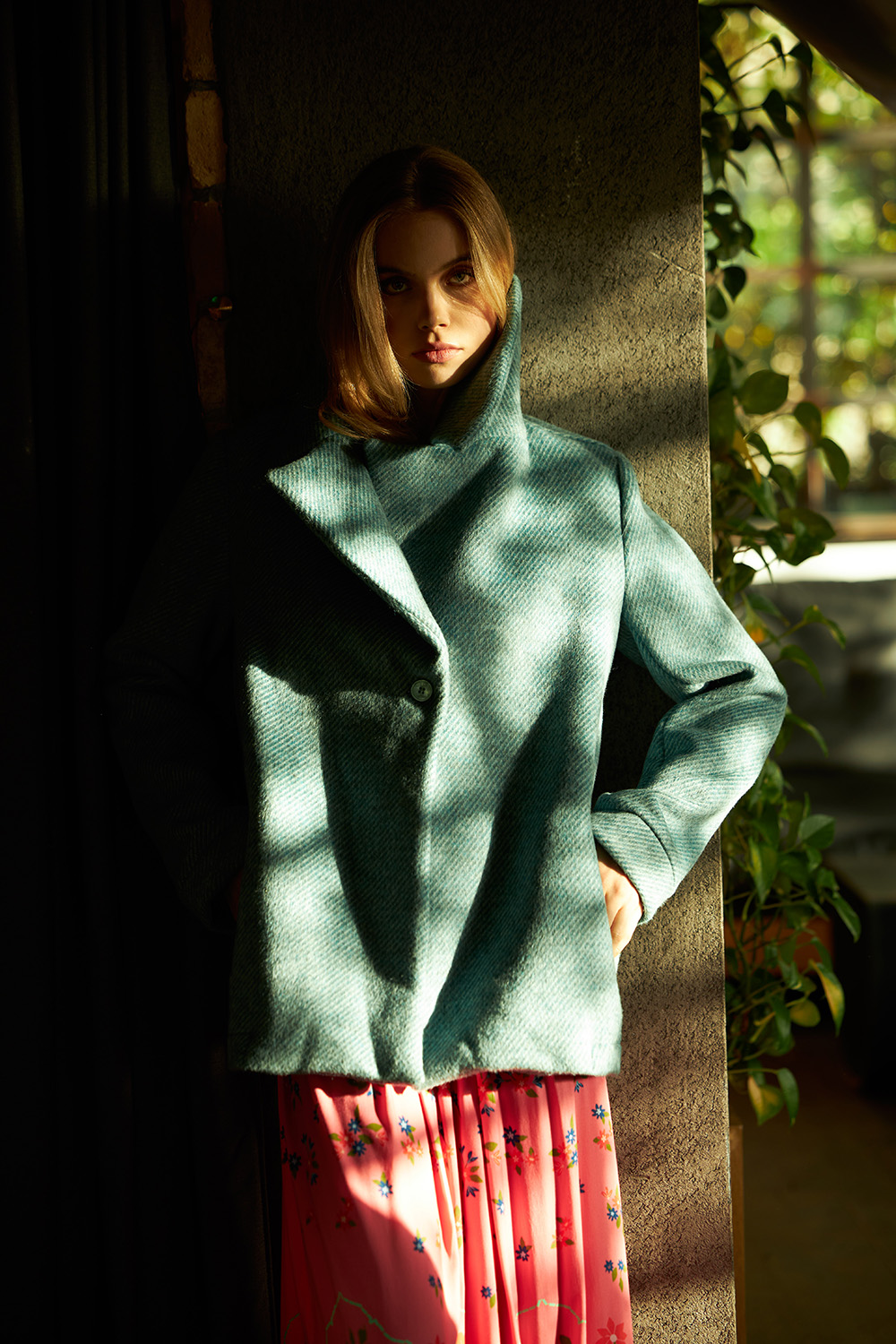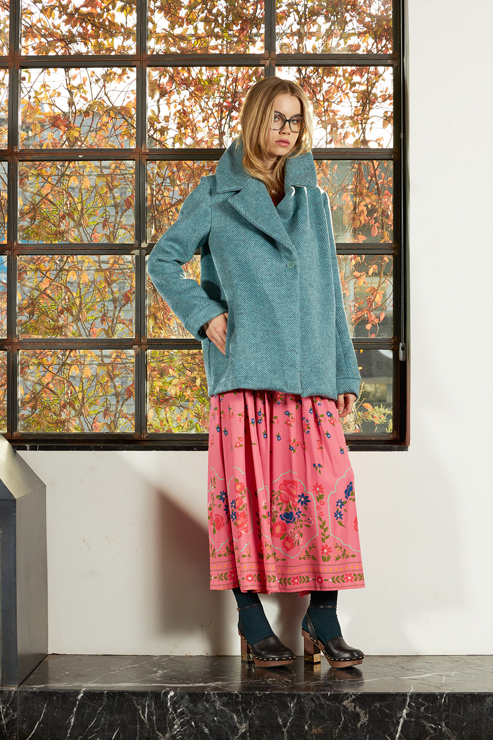 Oversized single buttoned coat with side pockets. With a characteristic large notched collar and big cuffs.