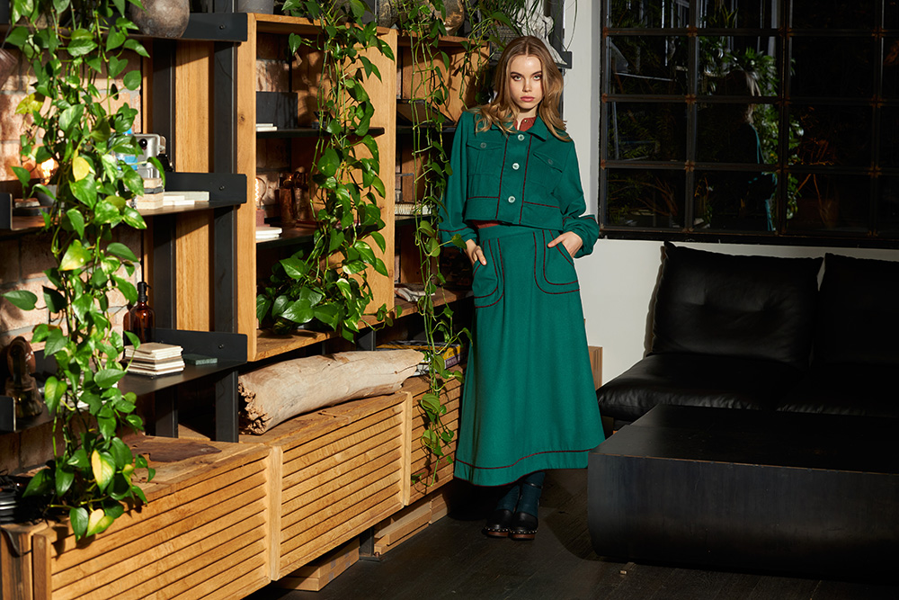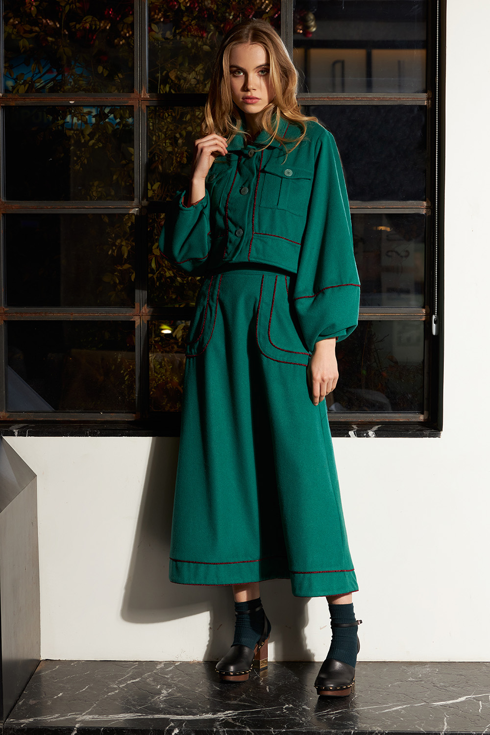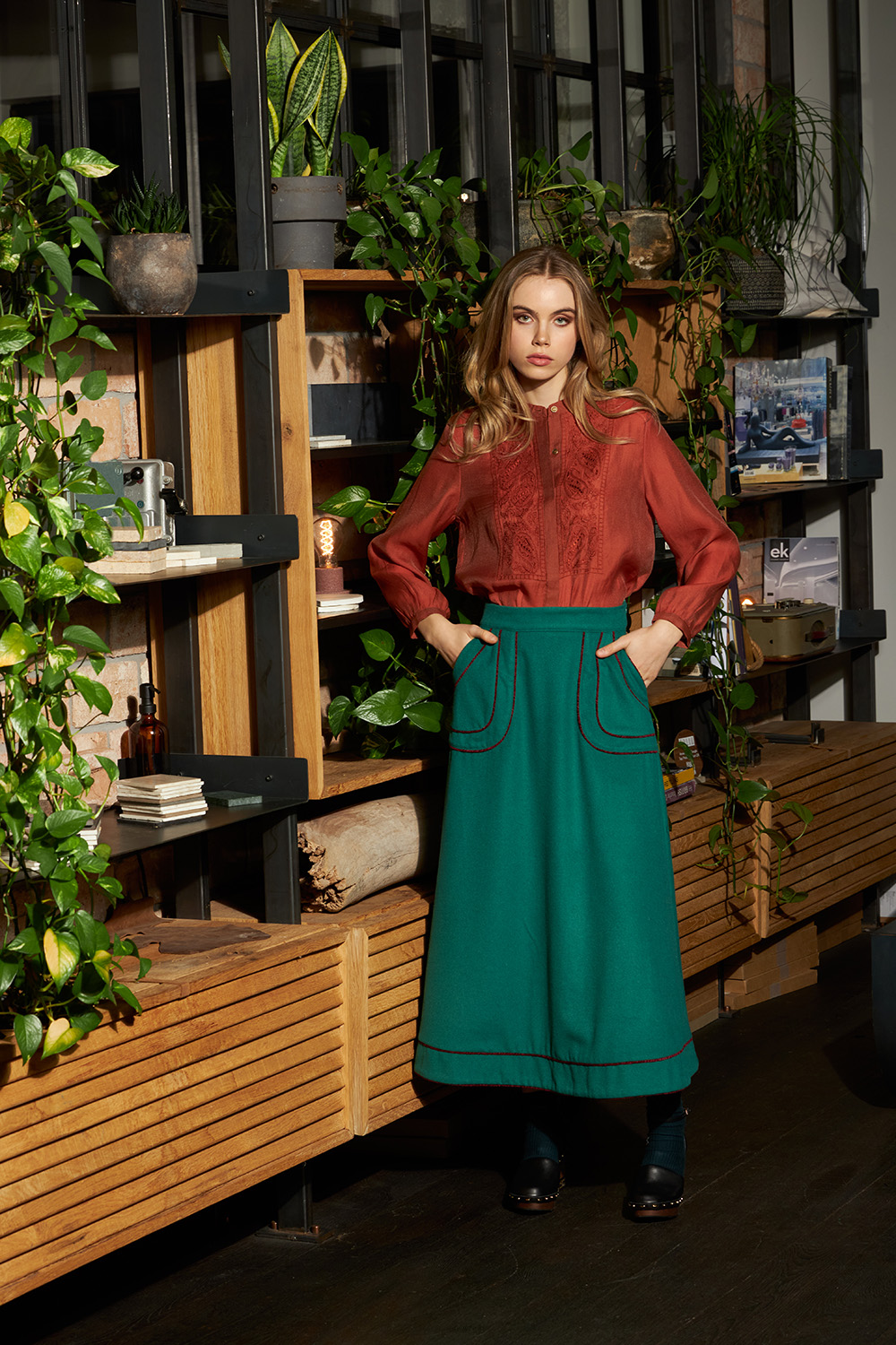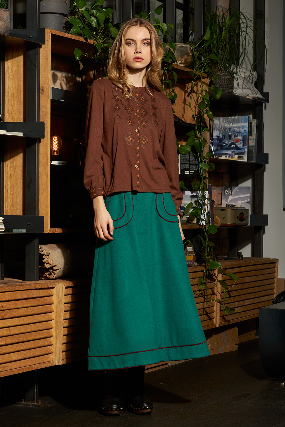 Midi high waist kloss skirt with large side pockets and piping in a contrast colour all around the waist, the end and the pockets.