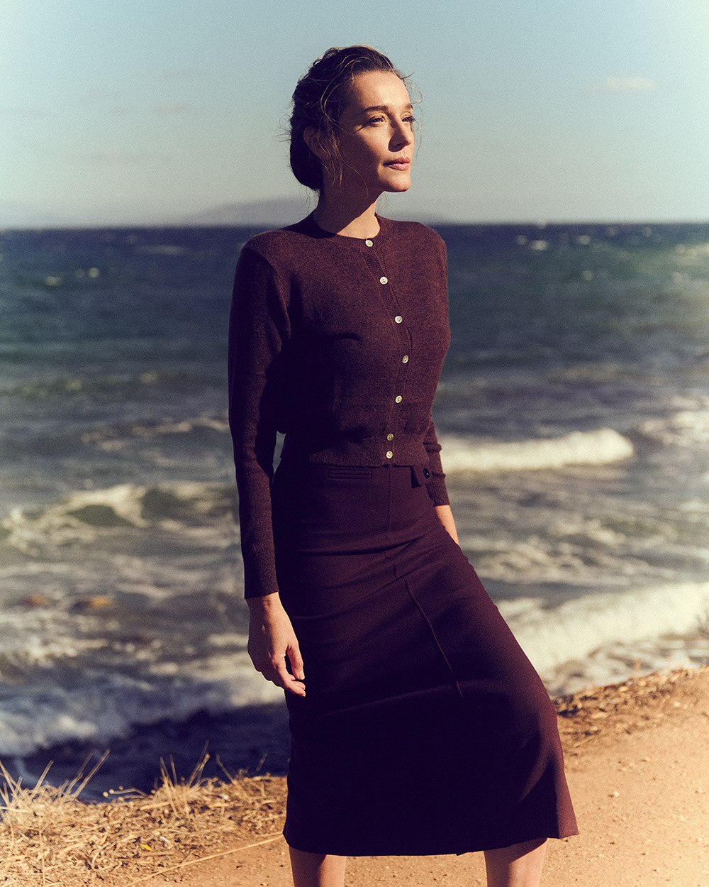 Slim fit cardigan with long sleeves and buttons on the front that once buttoned up they create a round neckline.
