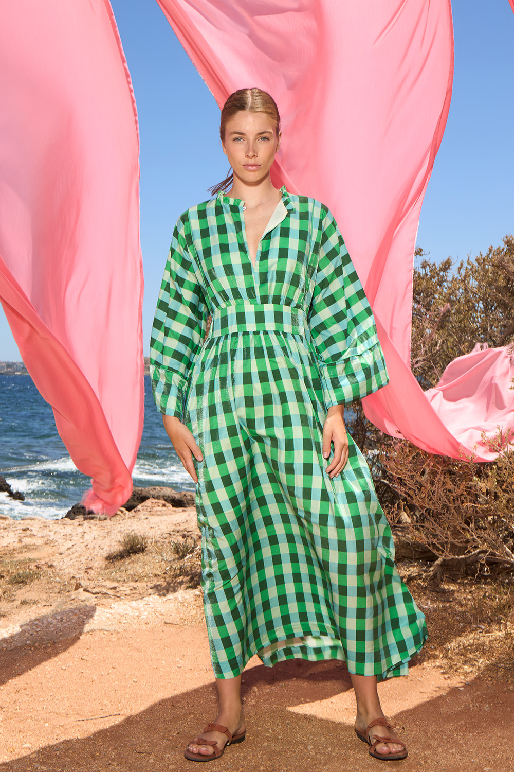 The Nadine Green Dress is a maxi slim fit dress with a zipper on one side. This playful plaid design with the long bell sleeves with pipping around the hem and the side pockets creates a remarkable image fool of joy. The V neckline with the distinctive ruffle at the end of it along with the large waistband complete a delightful image.