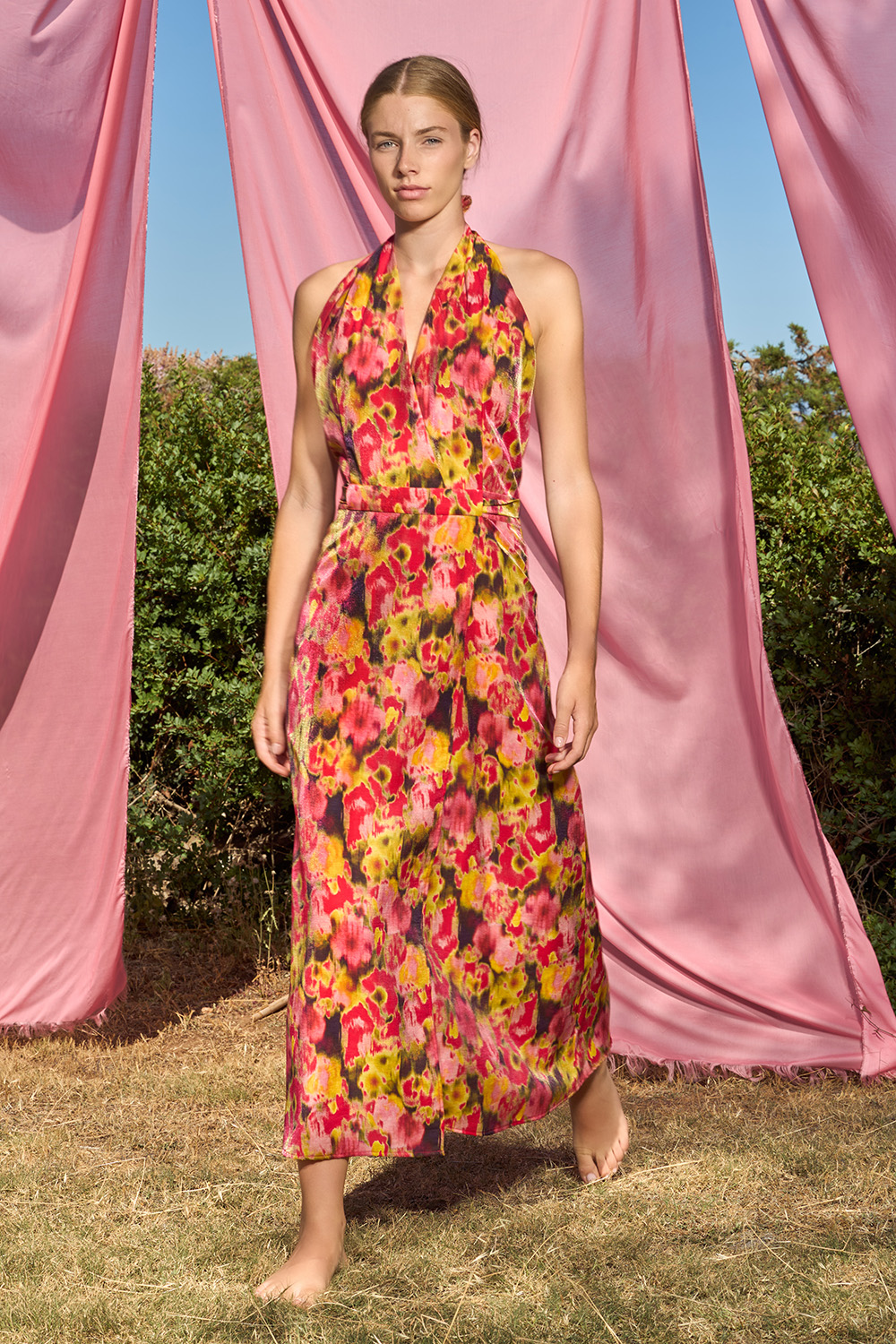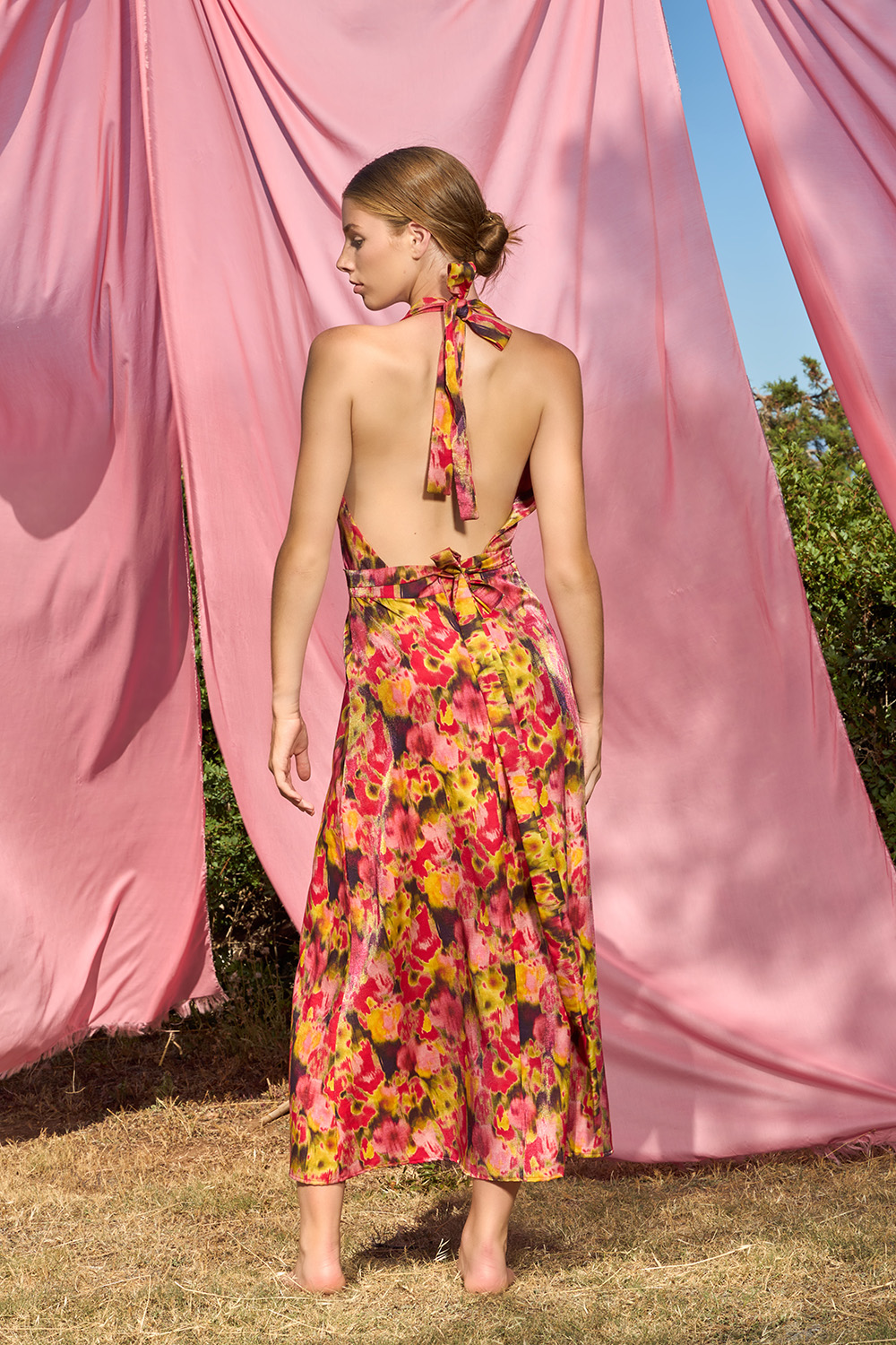 The Novy Dress is a midi length wrapped design made of silk. The halter neckline that tights at the back of the neck allows the hands to feel the breeze while the open back gives away some extra summer feeling. The belt around the waist offers this dress even more charm and adjustment and the zipper on the center back makes it easy to wear.
