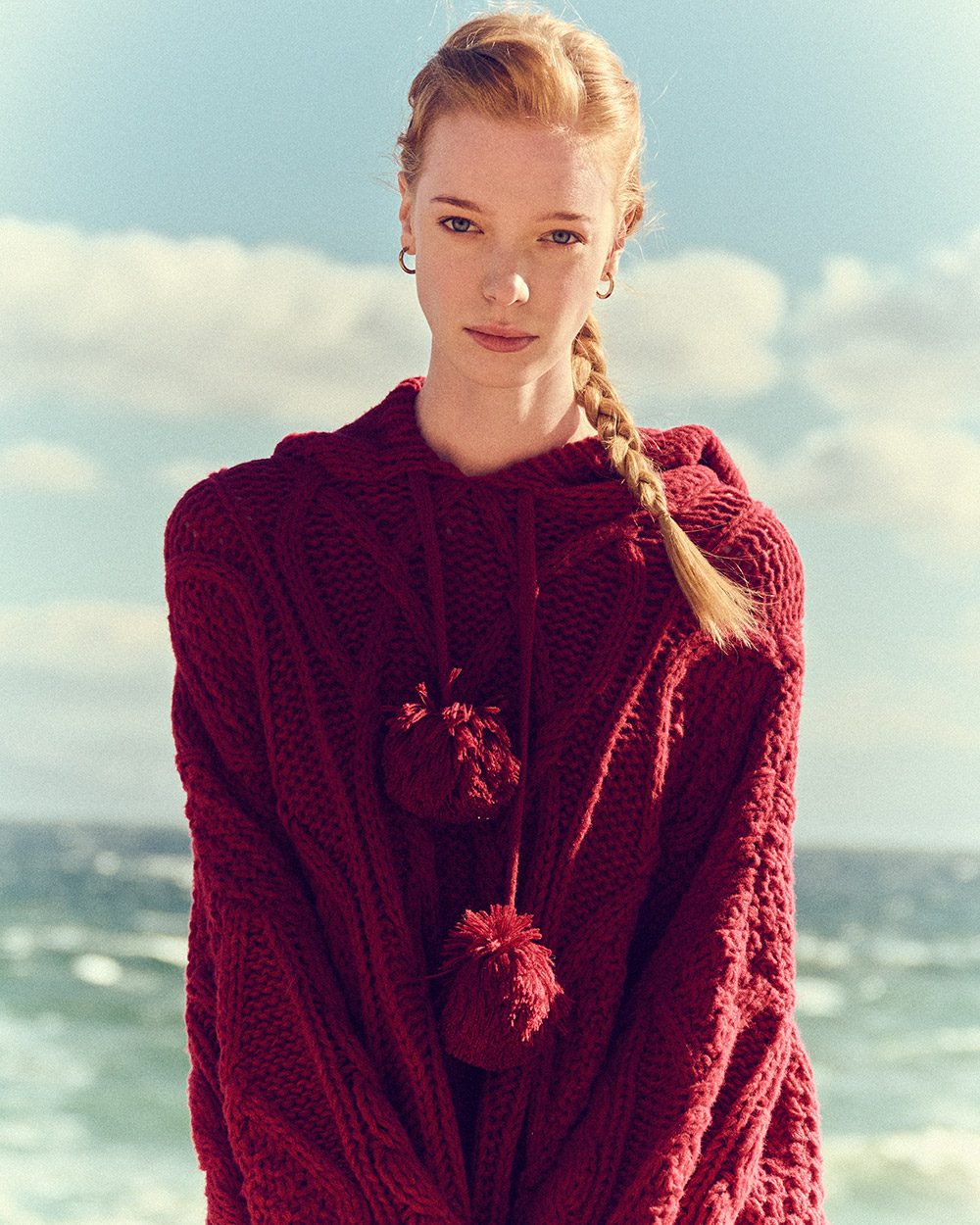 Oversized midi sweater dress made of thick knit. With long sleeves and a hood that adjusts with pom pom cords.