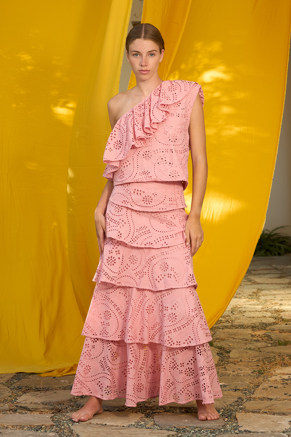 The Rosemary Embroidery Pink Top is an one shoulder regular fit cropped top full of charm. The ruffle all around the neckline along with the special embroidery that is spreading all along the cotton textile showcase all the beauty this piece is carrying and is ready for a special summer.