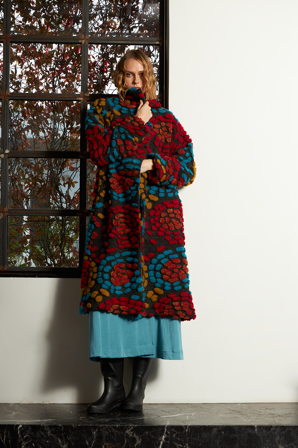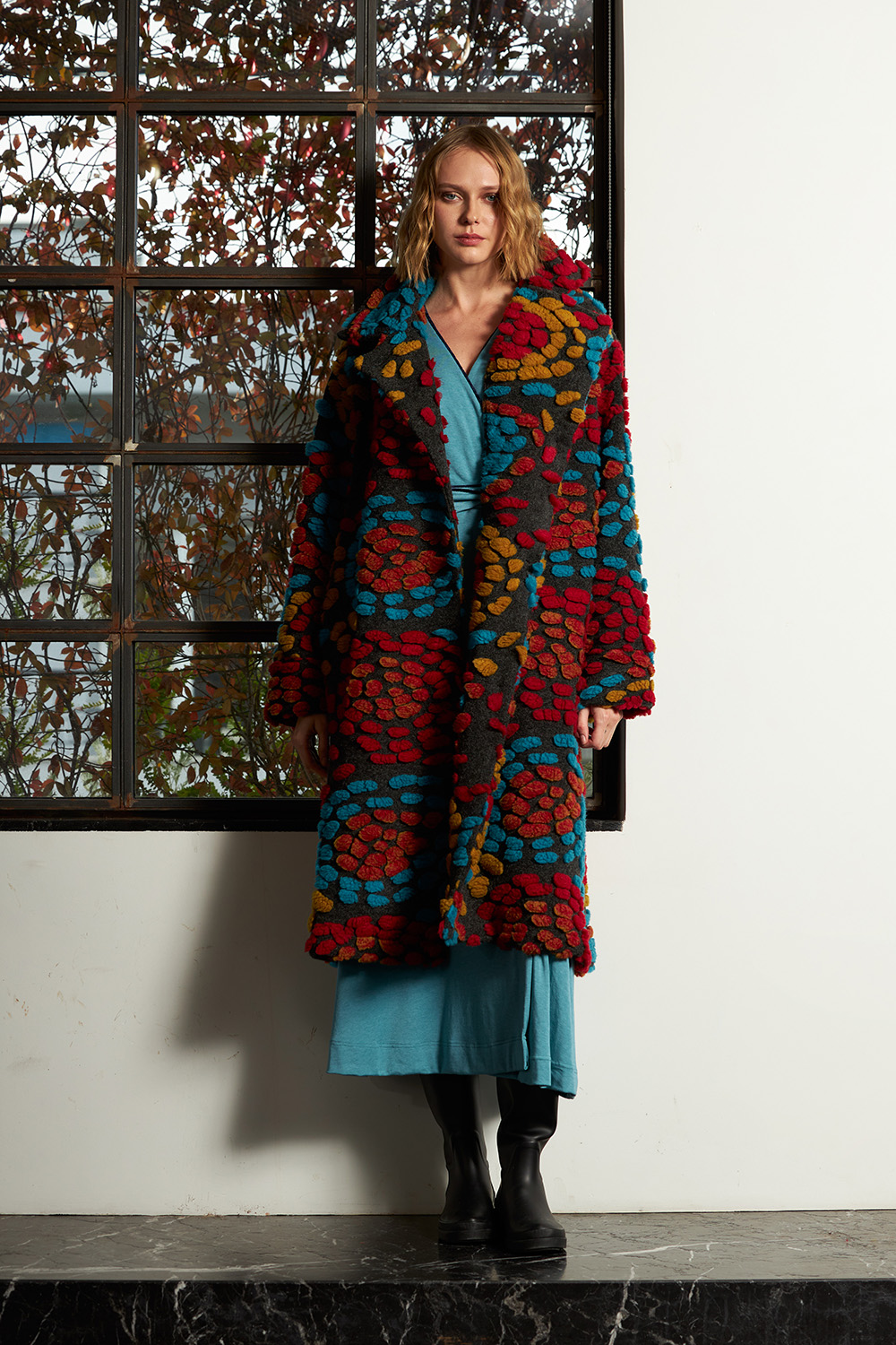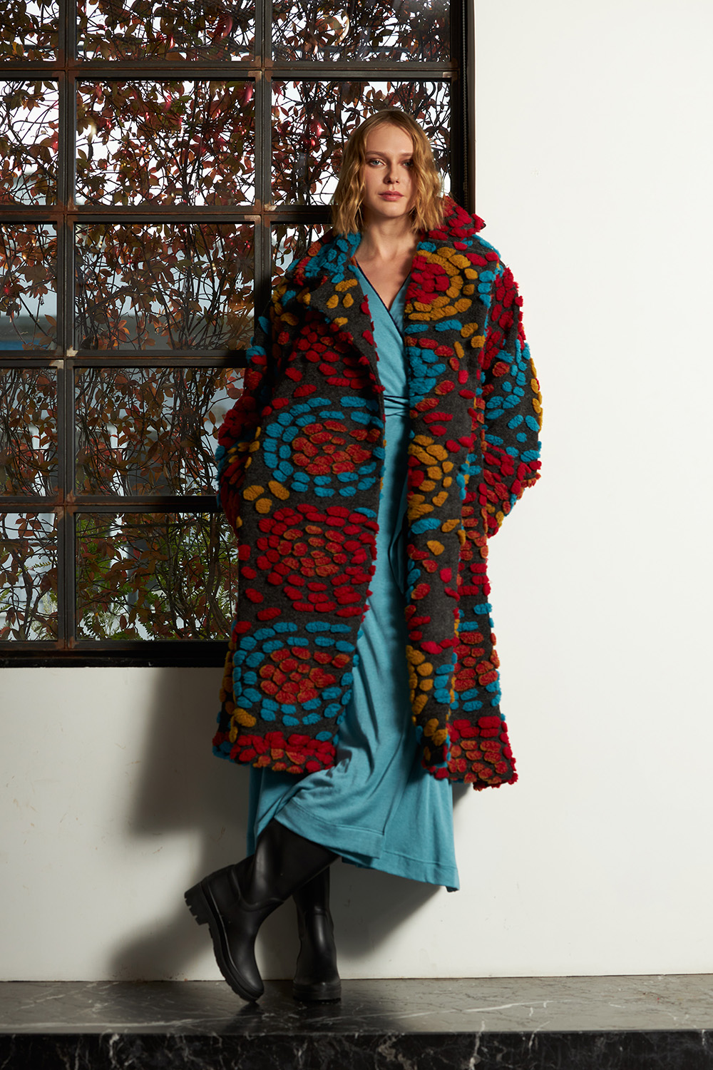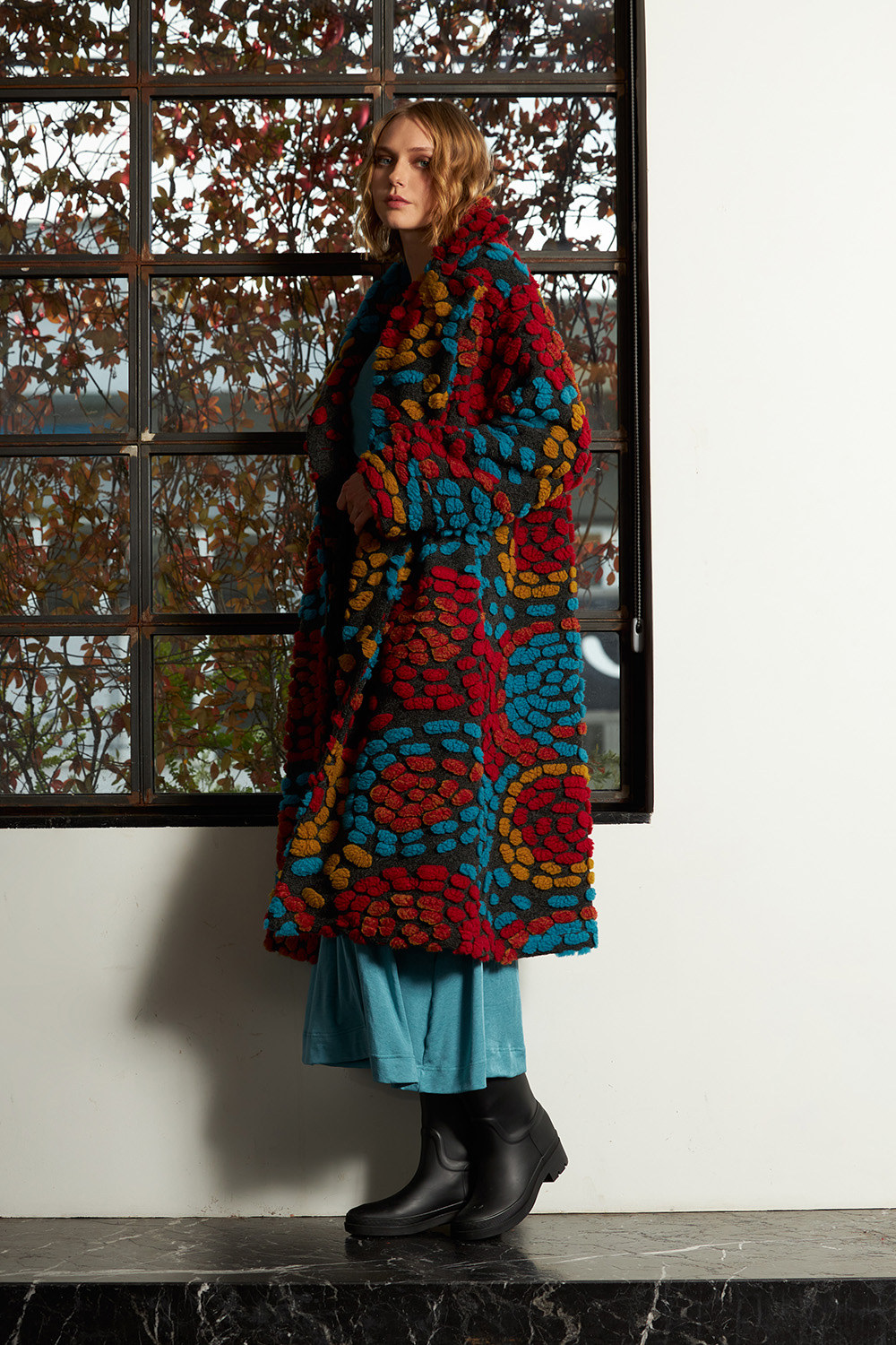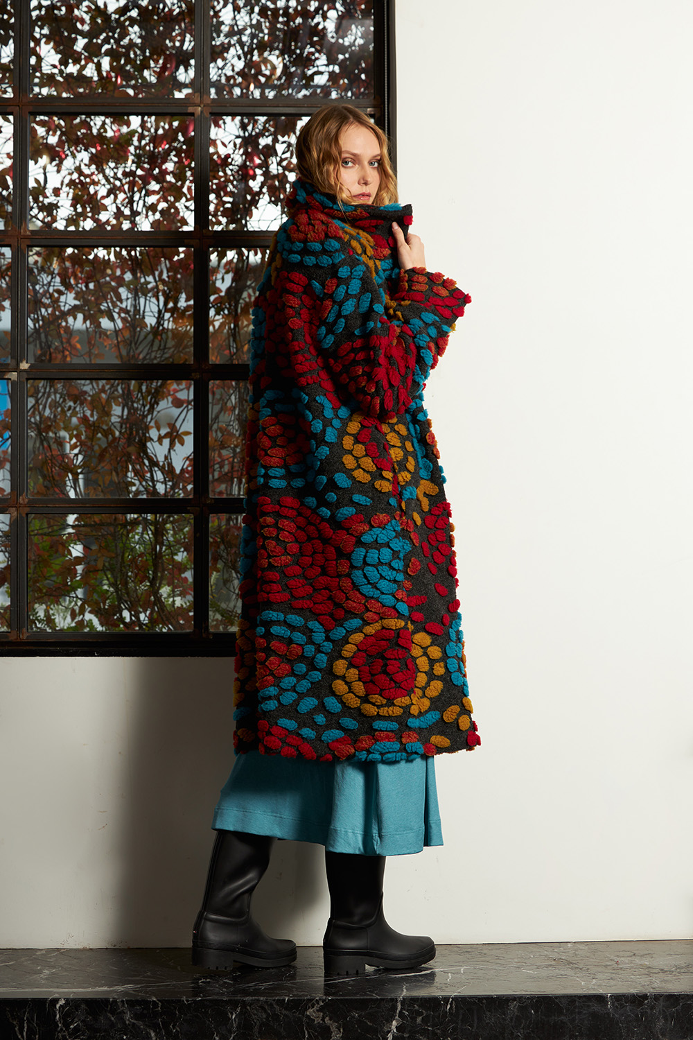 Midi length coat with long sleeves and big cuffs. With a distinctive large notched collar, buttons on the front and side pockets.