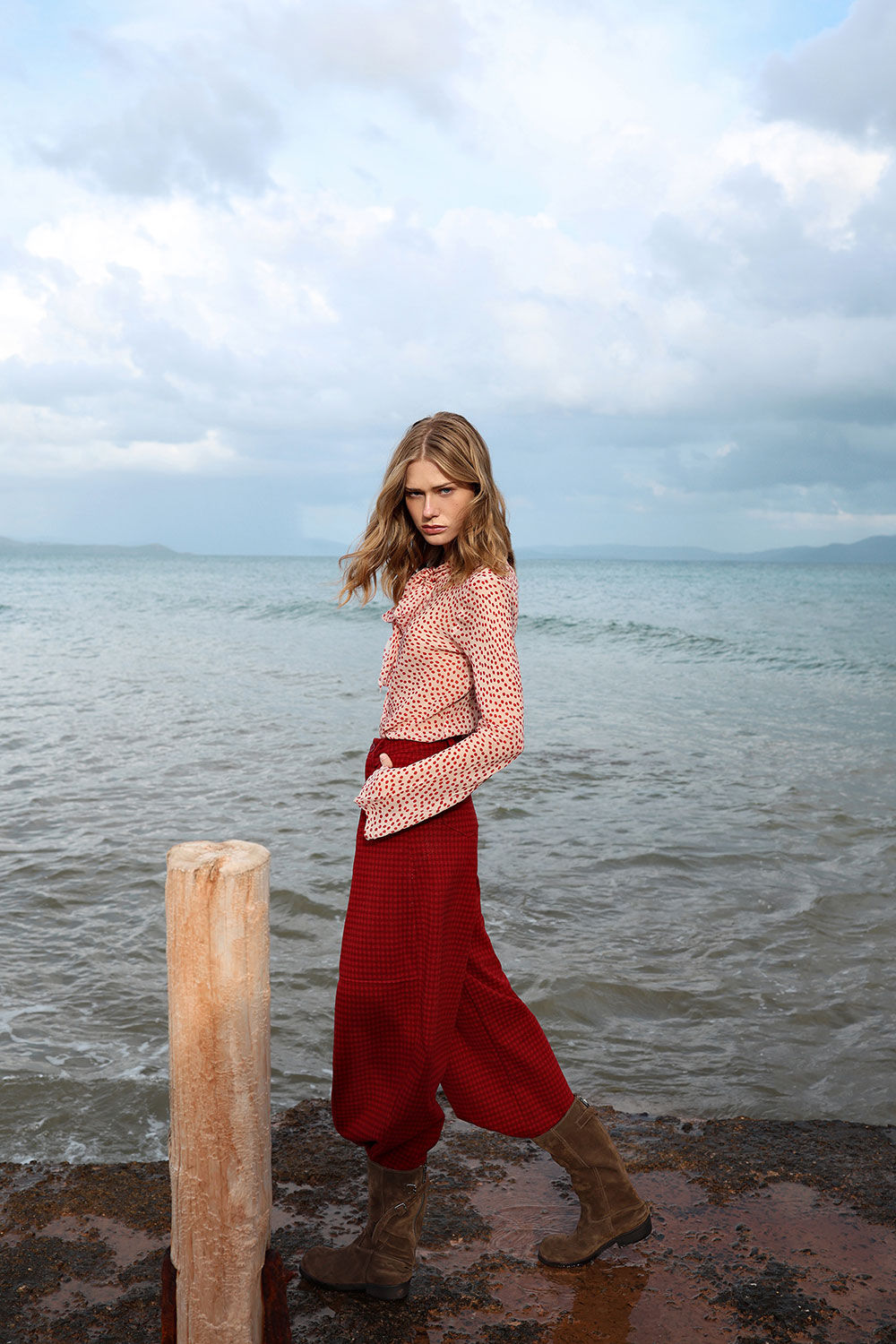 The Rozita shirt is a long sleeve, flowy button down, with ties that make a bow on the neck. It is romantic and breathable, with a polka dot print and made from 100% silk.