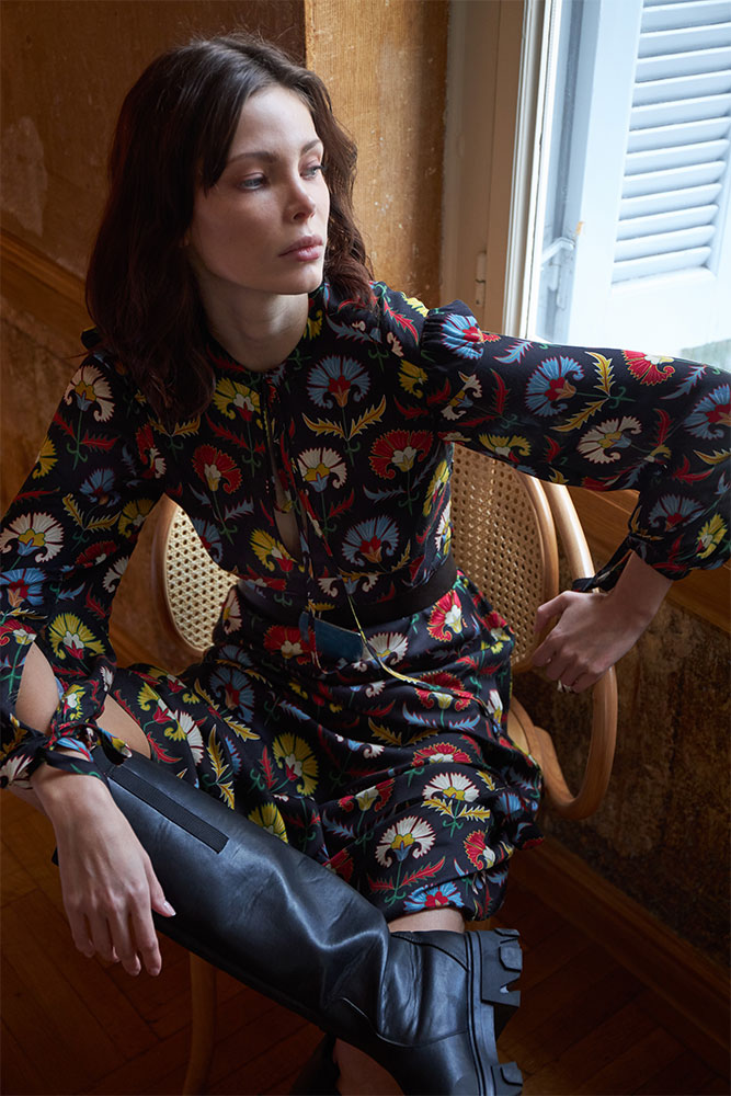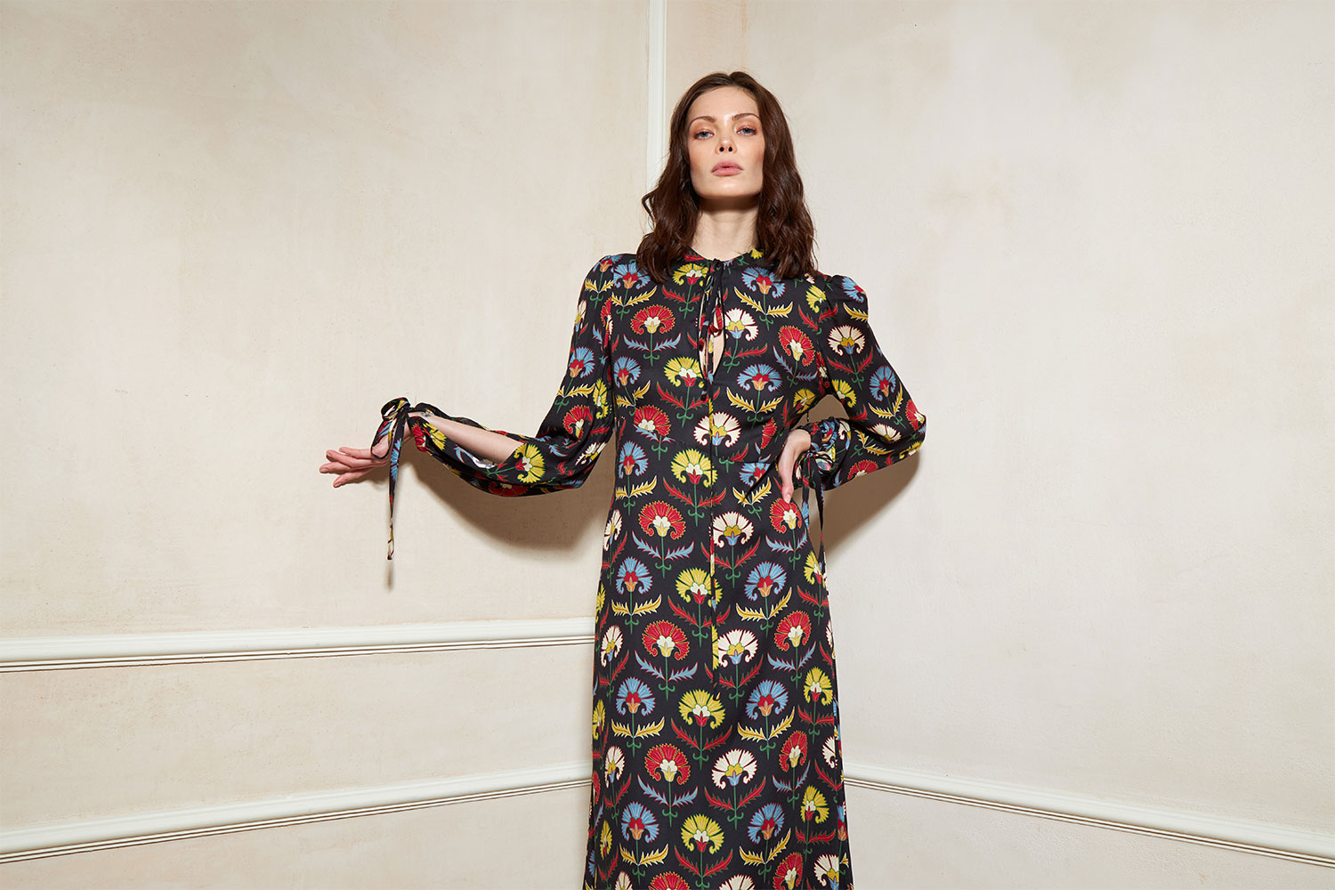 Long-sleeved dress with asymetrical waist, zipper on the side and ties on the neck and sleeves.