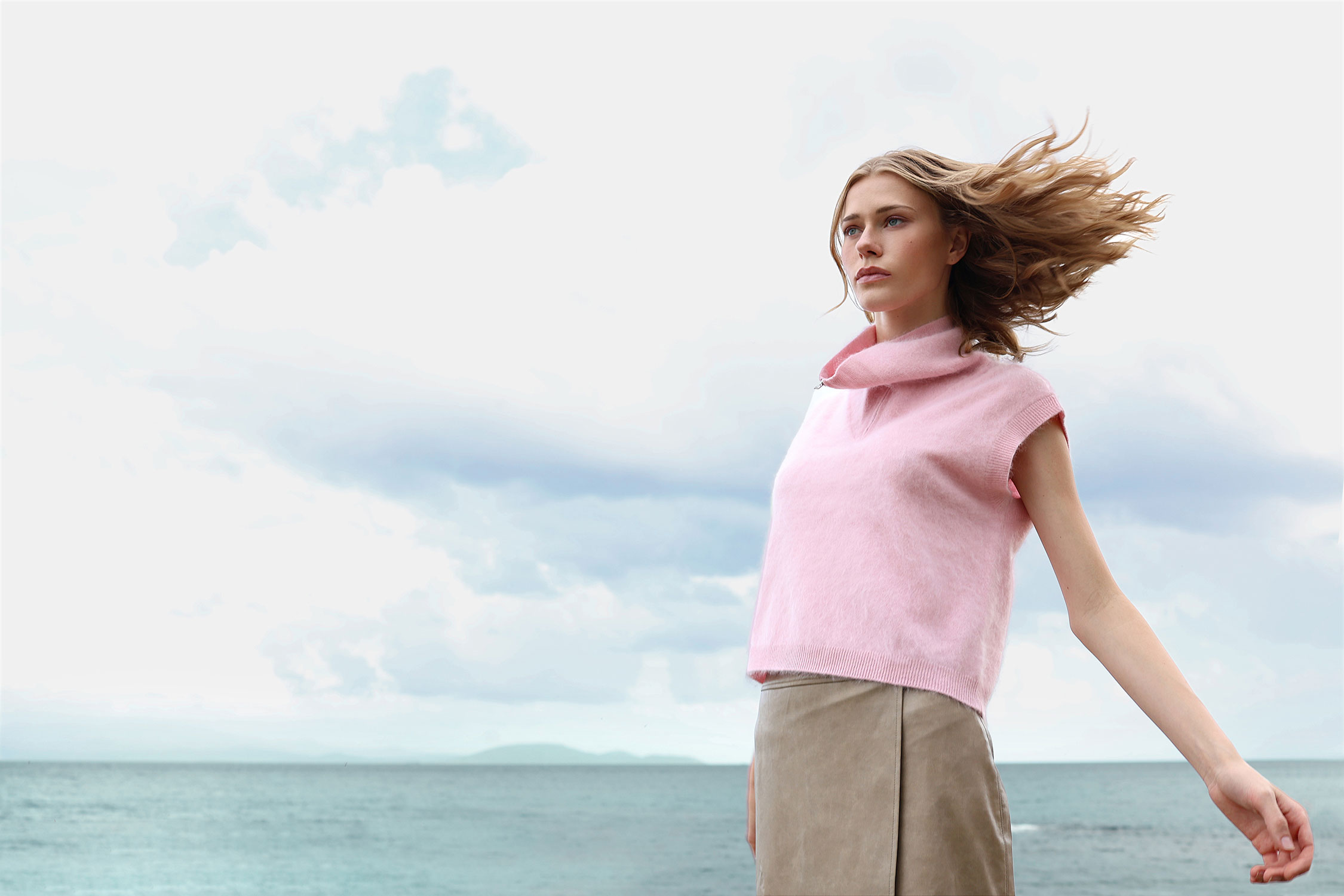 The Stefania sweater is a beautiful sleeveless cashmere top with a high neckline and a zipper that makes its turtle neck fold on the front, creating an interesting design, making it elevate any outfit.