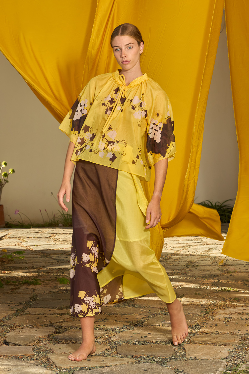 The Vinetbloom Shirt is a regular fit design made of the fine combination of silk and cotton. The round neck can close with cords creating a charming bow while the short bell shaped sleeves are creating the most appealing motion under the sun.
